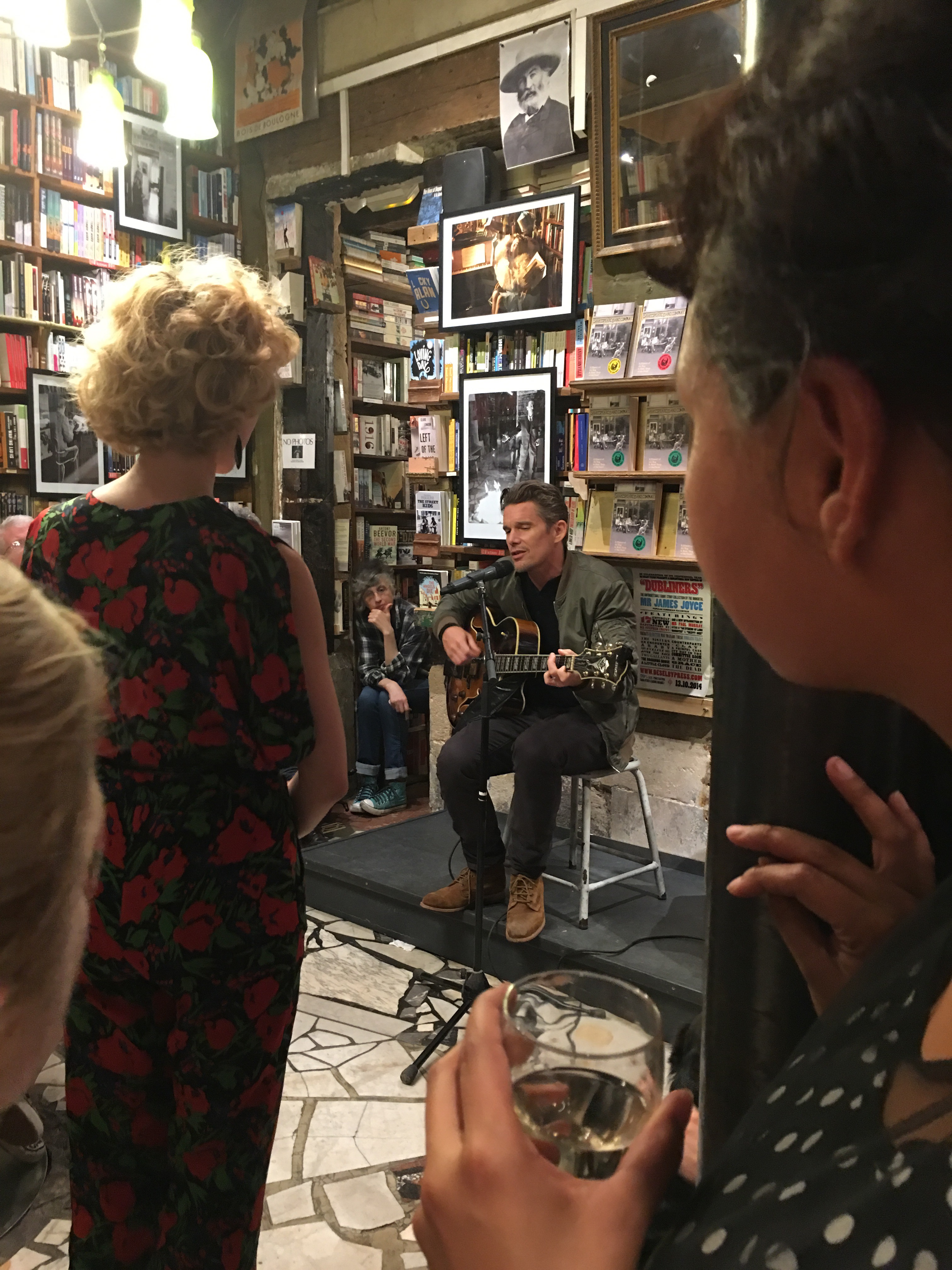 Tonight these dreams came true. Stars aligned the day I arrived in Paris , my ultimate destination bookstore is having a release party. The backdrop of the bookstore has served as my Facebook photo for the past three months, the streets of Paris line my vision board for the year , and I jokingly commented to my friends I would run into a character from the film that night. The cozy room was filled with writers , photographers , bookstore owners from around the world , and Ethan Hawke! It was one of those moments that lasted hours, and I had to continually remind myself to stay present. I needed to inhale how grateful and amazing life was.