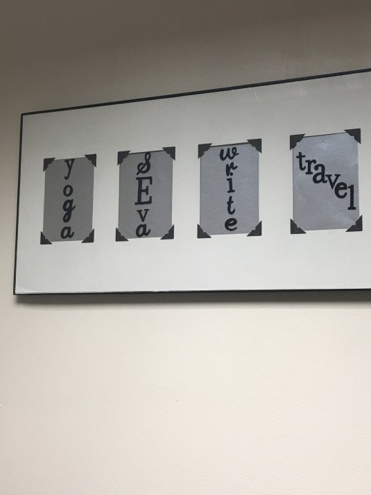 I have this frame in my office stating the words above: yoga, seva, write, and travel. My co-worker yesterday popped into my office and asked “what’s seva?” I answered, “in yoga and Sanskrit it means serving others .” The act of selfless service.
