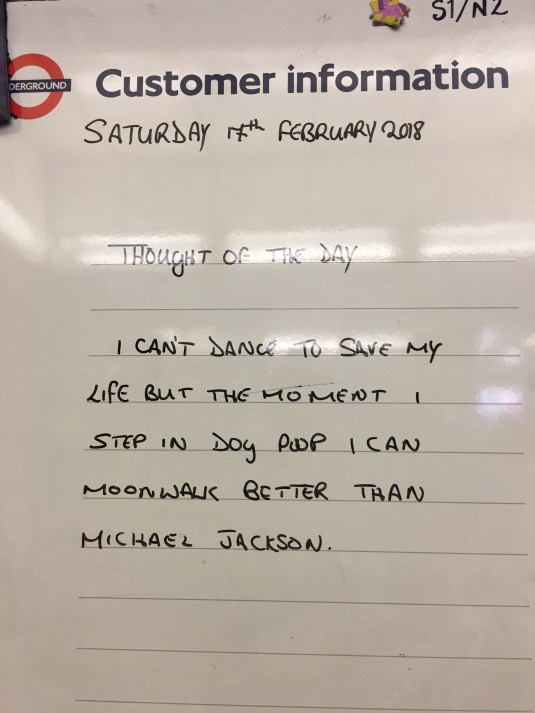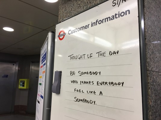 Once or twice a week I take the trek to London for my Jivamukti and flamenco classes. I have really come to embrace this tube stop. Each day, including weekends, a quote is shared. Perhaps people are too busy to glance at it, but I look forward to reading what unique thought is shared to the locals by Tube staff. Today I noticed another traveller smiled as she passed by this obscure quote.
