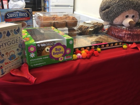Yesterday we hosted our first hygge day at work. In some ways it was perfect: there was snow, we all wanted to be cozy, it was international hygge day, and I had the entire day set with volunteers for morning and evening. I even made a stuffed animal our mascot: Hygge the Hedgehog. I sent numerous advertisements out, visited people’s workspaces to promote the event, purchased loads of sweets , and even found a hedgehog cake.