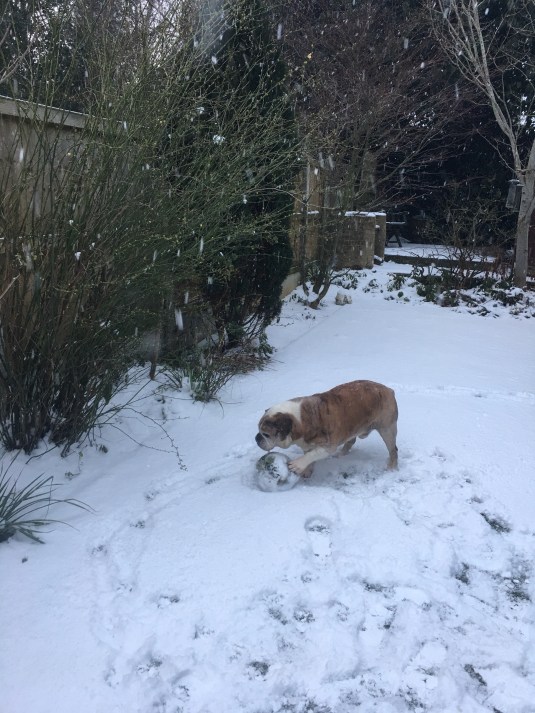 And so the hygge began. I played with my dog outside. I was reminded yesterday how much my dog loves snow. He would play his version of soccer, but get distracted by wanting to eat the ice or witnessing the snow fall magically on his face. We don’t see much of snow here in the south of England that sticks to the ground. Snowfalls never occurred during our California and Hawaiian day. Somehow Puzo ,our bulldog , remembers his romps in Connecticut and New York . And he couldn’t get enough of relishing in the snow. Puzo was practicing mindfulness of snow play. He was my real life hygge mascot.