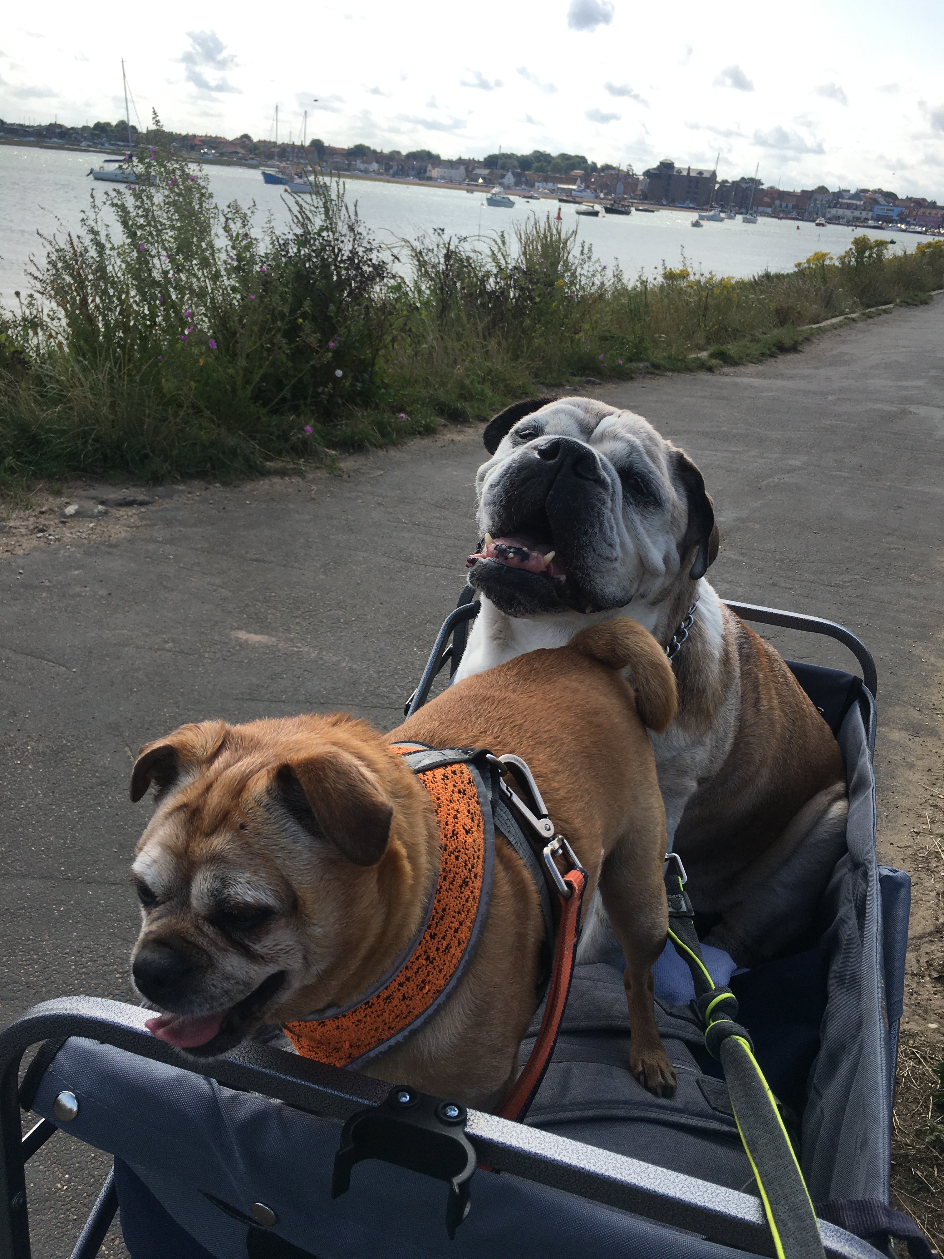 I arrived at the Wells-next-to-the-sea early in the day, or so I thought. It was 10:30 AM. Two parking lots were full, and a spill over parking lot was made available. Intuition warned me of this, I knew the next parking lot was 1 ½ miles away. I didn’t mind the walk, but my 14 year 2 month old English Bulldgo Puzo may not be able to handle it. I brought a stroller (or as the Brits call it “pram”). He got in, and the joyride continued. We stopped along the way, to let their paws and my feet play in the shallow waters where the boats parked. The sun began to shine on the newly formed picturesque day. Puzo smiled as he sat next to his 12 ½ year old sister Bella in his pram. They listened to the sea breeze and got the attention and grins of fellow beach goers. We stopped at another shallow area to briefly cool off and take in the scenery, but our journey continued. Past the scenic walkway, through the woods, towards the dog friendly area. After the one hour stroll, we finally arrived to the beach. We took in the scenery of vintage beach houses, happy families and friends, and dogs grateful to be included in the festivities. The beach was gorgeous and serene, and I was grateful I could take them to appreciate the shore for another year. I’m reminded our time together is limited, and every ounce of joy I can give them is worth it.