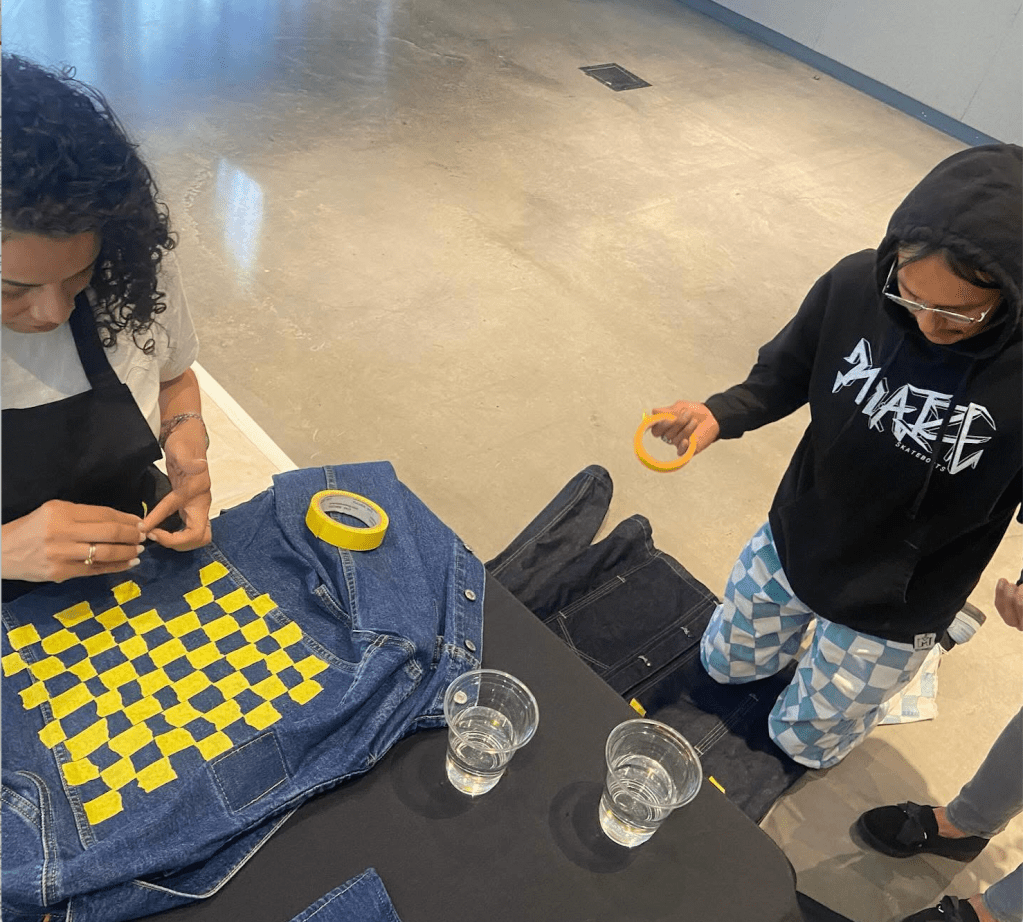 And here we were in a free denim workshop. She gave us permission in that moment to create for the sake of it. As we did, there was initial hesitation and trepidation, what if we paint something and it’s wrong? There’s no erasing…. But we began to follow our intuitive hits. My friend Crystal, had images of faded checkered lines on the back of her denim coat, and was advised a way to seek out those results. My mom free styled a Desigual-esque vibe, as I tried to mimic the essence of examples that were hung of denim with indigenous patterns. Beats played in the background, we all got in the zone, chatted, and painted. It didn’t matter what the results were, we temporarily were all being creative collectively. And there was such beauty in this…