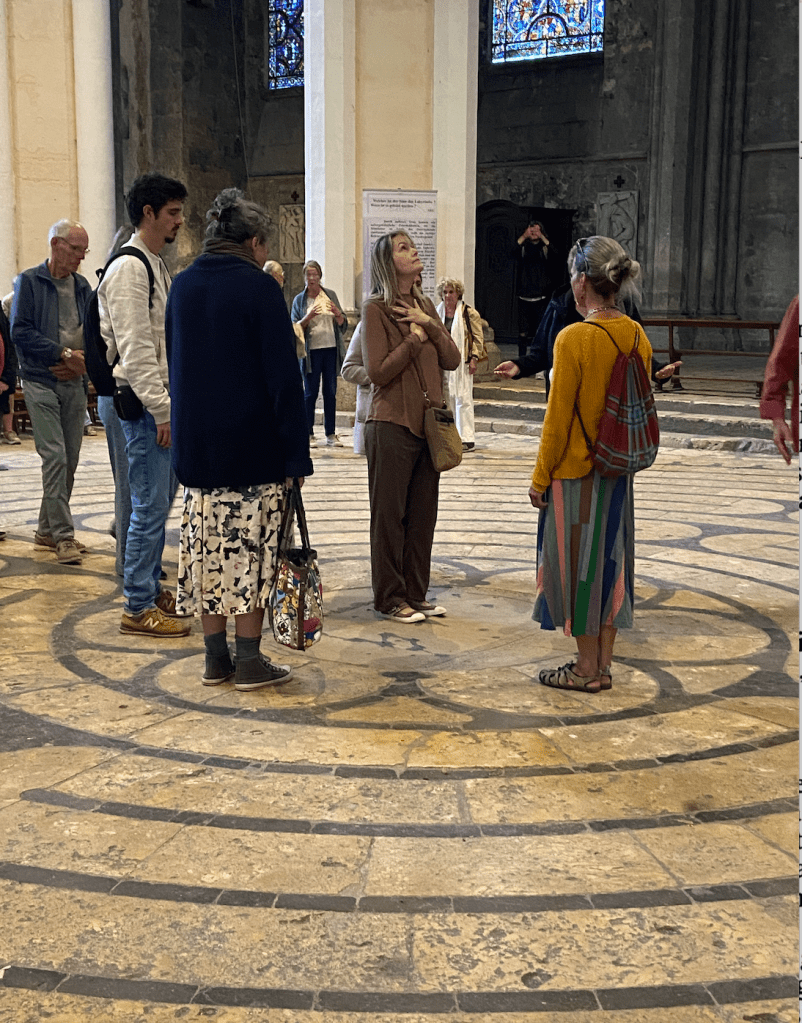 And so the pilgrimage really did begun. Each persona we met with during the day served as an archetype for the journey: the victim, the doctor, the police, the staff, and the president.   We were prompt to arrive at Chartres Cathedral, as we were aware the labyrinth is only open for several hours on Fridays during some parts of the year. But as we walked to the Cathedral, we noticed crowds of students gathered outside and inside.  Was it a massive field trip or something else?  I later learned it was a photo op with President Macron.  We were so in the zone of the moment that we didn’t seem to absorb he was in the Cathedral the same time as us.  The labyrinth appeared before us, uncovered from the chairs that usually sit on top of it. I was curious how this labyrinth experience would compare to others I have done in the world.