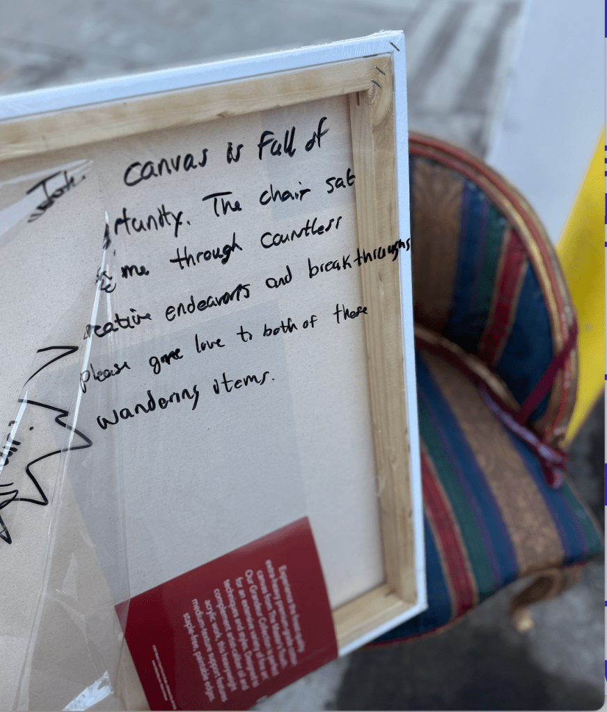 Several weeks ago, I was in Santa Fe New Mexico, inspired by the communal creative vibe that exuded from that city. I went home, wanted create art, and was on the hunt to find a canvas.  I stepped into various everything store shops, and couldn’t find the perfect size.  After having lunch with a friend in Silverlake, in the parking lot was a new canvas and a chair, with a note from the previous owner offering his blessing of creative possibilities to the new owner. I manifested this!